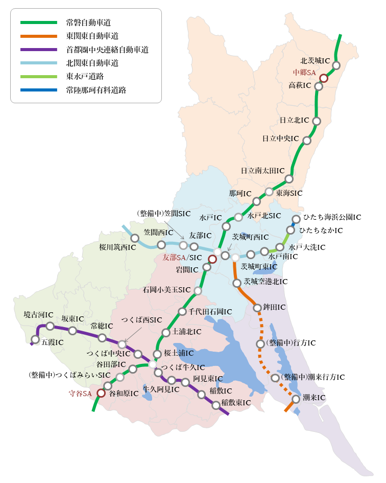 茨城県を南北に貫き埼玉県三郷市と宮城県亘理郡亘理町を結ぶ総延長約300㎞。三郷ICでは首都高速6号三郷線と東京外環自動車道に接続、亘理ICからは仙台東部道路に直結し仙台市内につながっています。首都圏と東北地方をつなぐ大動脈のひとつです。